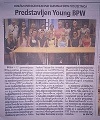Članice BPW Pula održale su 29.06.2015. međugeneracijski sastanak BPW poduzetnica. U uvodnom obraćanju predsjednica BPW Pula Alida Perkov zahvalila se koordinatoricama odbora mladih poduzetnica u prethodnim mandatima Patrizia Milani i Rina Lumezi na dosadašnjem zalaganju i uspjesima. Perkov je uputila motivacijsku poruku mladim poduzetnicama usmjerivši ih na korištenje savjetodavnih i financijskih potpora naših institucija ali uz praćenje trendova recesijski otpornih djelatnosti kao i opredjeljenja pametne specijalizacije koje proizlaze iz Strategije industrijskog razvoja RH.