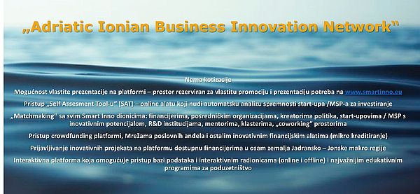 S velikim Vas zadovoljstvom obavještavamo kako je s radom krenula „Adriatic Ionian Business Innovation Network“, u okviru europskog projekta Smart Inno IPA CBC Programa. Platformi možete pristupiti putem linka www.adriaticinnovationhub.com, nakon prethodne registracije.